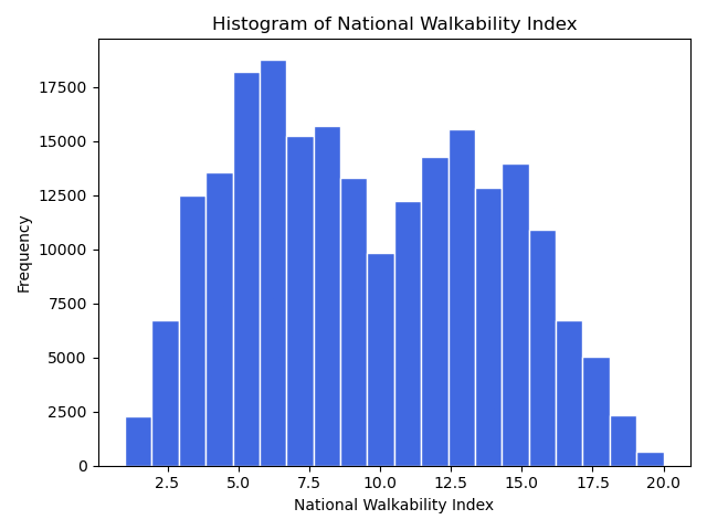 Interestingly, Figure 2 shows that the National Walkability Index has a bimodal distribution. This ultimately makes more sense than first meets the eye. Plenty of CBSAs are in rural or semi-rural areas with little access to public transportation or sidewalks, and the nearest grocery store being well past walking distance from most people’s houses. Therefore, these CBSAs correspond to the first peak of the histogram with a relative lack of walkability. Likewise, because CBSAs are dependent on both area and population, it is not shocking to see many CBSAs with a walkability index on the higher end, as these CBSAs likely correspond to those in larger cities. This graph ultimately lines up nicely with the United States population being split between urban and rural areas.
