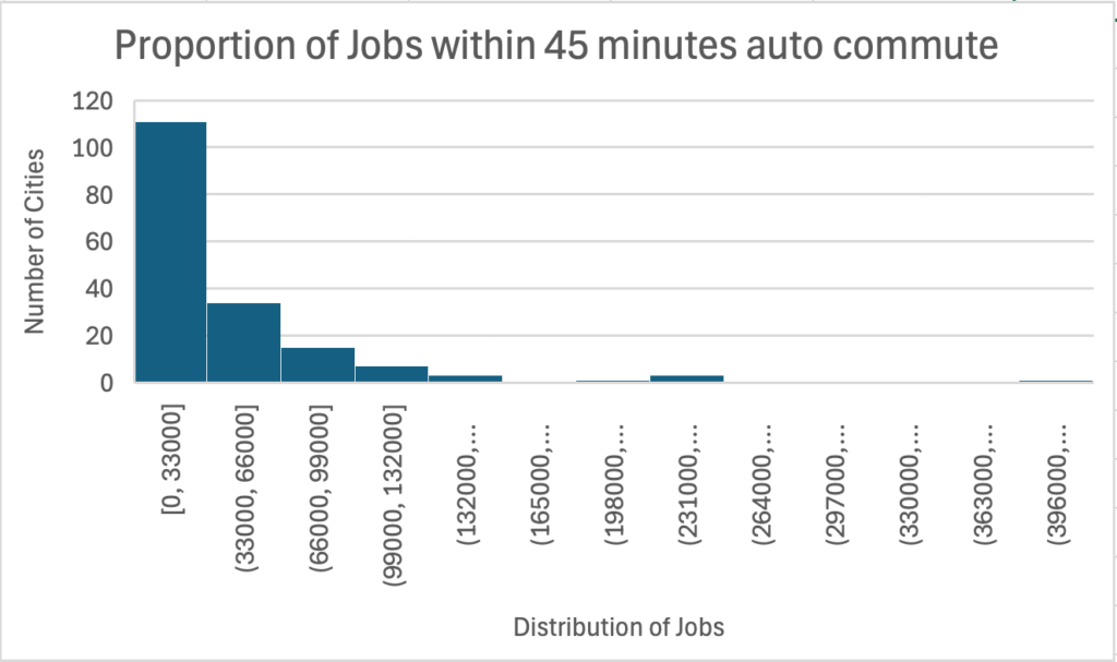 This histogram shows that in over 100 cities, the number of jobs within 45 minutes by car is between 0 and 33,000, showing that most Americans indeed live within a driveable commute from their place of work. Furthermore, this histogram is right-skewed, meaning that there are nowhere near as many jobs outside of 45 minutes of commuting. Ultimately, people in American cities are, on average, likely to live within 0-90 minutes of work. This is important because public transit is meant to serve a large population of people, and if many people have the same constraints to get to work, public transit can be made a more efficient and effective option to get to work. Therefore, public transit can indeed be an option for many Americans to get to work, which will improve the walkability of American cities overall.