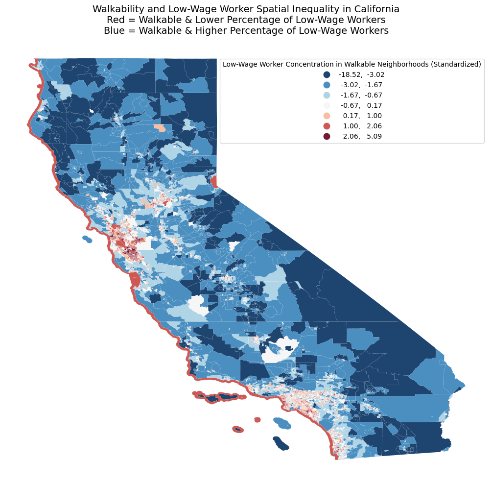 The map showcases the spatial relationship between high walkability neighborhoods and the percentage of low-income workers in those neighborhoods across each block group in California, which highlights the deep divide between the high percentage of wealthy individuals living on the coast and the other areas of the state. The socioeconomic spatial patterns are represented by a divergent “Natural Breaks” color scheme, where the deep red represents high-walkability areas with lower percentages of low-wage workers, whereas the deep blue represents high-walkability areas with higher percentages of low-wage workers, and white represents the transition zone between those two extremes as classified by the Jenks Natural Breaks method. From a geographical perspective, the intense red clusters are located around the coast regions, such as the San Francisco Bay Area and West Los Angeles, while the deep blue clusters tend to be in the Central Valley, rural areas, and urban peripheries. This visualization is significant to the project because it touches upon the concept of infrastructure exclusion, where the benefits that walkable urbanism has are decoupled from the workers who could rely on it the most due to differences in socioeconomic status. Thus, this map can be useful in the project in determining where the discrepancies between the locations of walkable neighborhoods and the locations of where the people who can benefit from it the most (low-income workers in urban areas across every block group) arise.