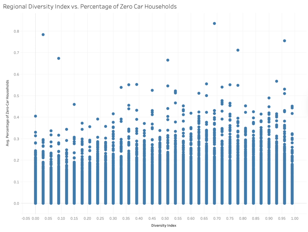 This graph shows that regions with higher diversity index values tend to have slightly higher percentages of zero-car households, with variation across individual areas. Thus, more diverse communities are oftentimes more dependent on non-automobile forms of transportation. This also lines up with the notion that larger cities, which have greater access to public transportation and nearby businesses, are more likely to be diverse than rural areas.
