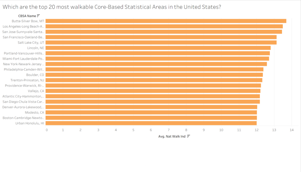 As shown in Figure 1, the most walkable Core-Based Statistical Areas (CBSAs) in the United States often correlate to larger cities, such as New York, San Francisco, and Los Angeles. This makes sense, as these cities often contain denser infrastructure, extensive public transit systems, and mixed land use, allowing residents to reach their workplaces without relying on car use. Some notable exceptions include Butte, Montana and Lincoln, Nebraska, but, otherwise, the most walkable CBSAs either are larger cities or are near larger cities.
