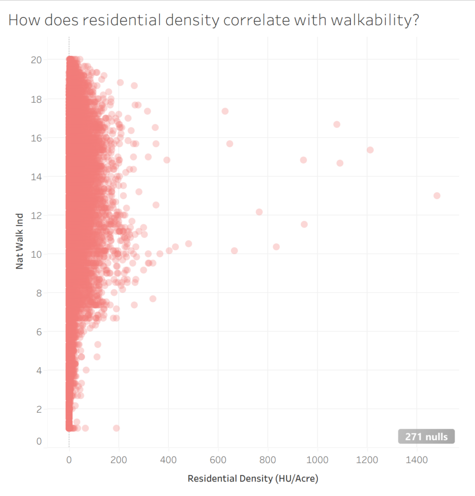 Going back to the topic of infrastructure density, we then examined whether residential density has a direct correlation with walkability. Urban planning theory generally assumes that higher density naturally leads to greater walkability.
